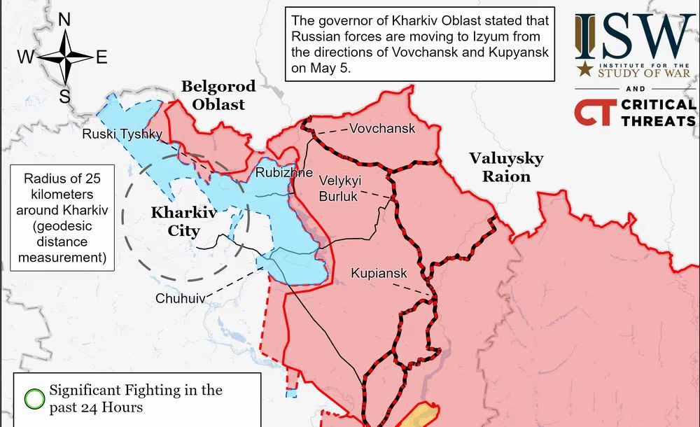 目前俄军正集结力量,试图在沃夫甘斯克(哈尔科夫市东北约60公里)以东守住一条线路,以确保从俄罗斯境内的物流中心贝尔戈罗德经沃夫甘斯克,再到伊久姆的后勤补给线安全。