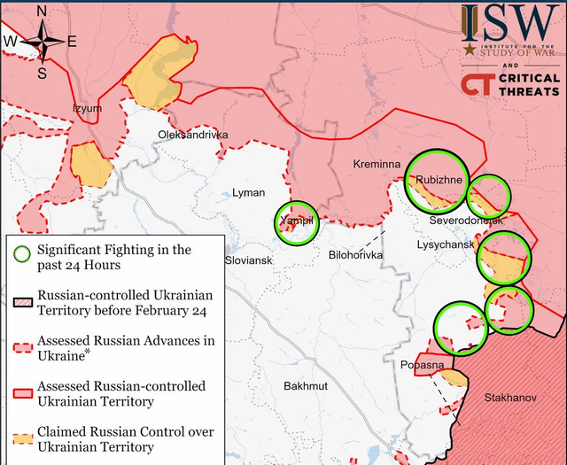 这种说法还是很有道理的,目前俄军正从卢比什内、塞韦尔东涅茨克向西南,波帕斯纳向东北推进(下图各圆圈处为目前俄军的主要进攻点),似乎意图包围这一区域的乌军。