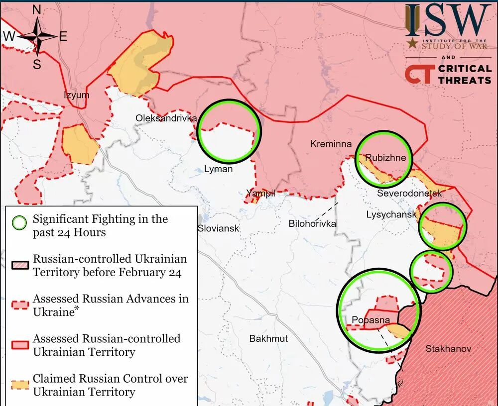 过去24小时,俄军继续在莱曼、卢比什内、利西甘斯克以及波帕斯纳等地(下图圆圈标示的地方)进行小规模地面的进攻,可以预见,这些地区也将是他们接下来一段时间的主攻方向,目标是完成对卢甘斯克的包围与完全占领——这可能也是俄军顿巴斯战役新的终极目标。