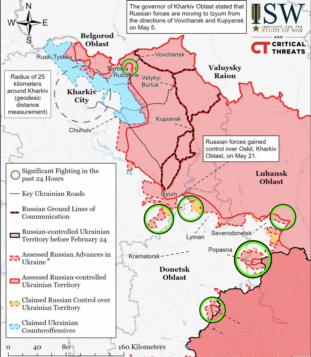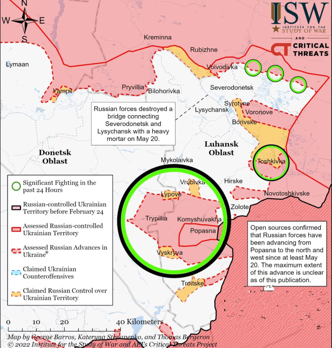 此外,从5月20日开始,俄军在波帕斯纳亚(Popasna)的北部和西部取得了一些进展,他们很可能会进一步向西攻下巴赫穆特(Bahmut),再北上包围北顿涅茨克——尽管这一目标不太可能快速实现。