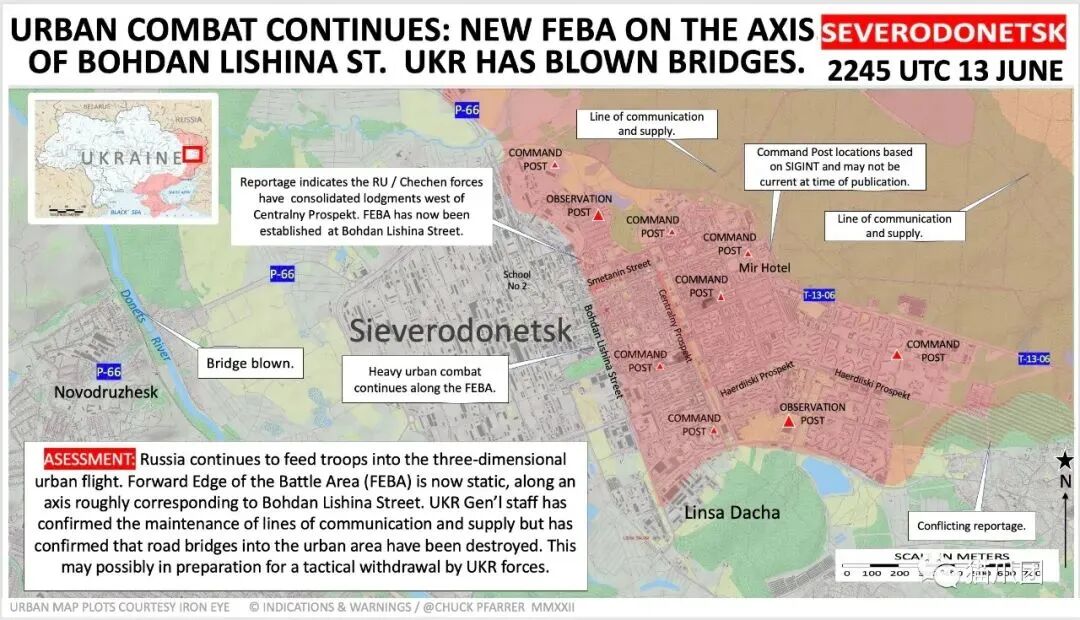 目前乌军的确已经撤出北顿涅茨克市市中心,但他们仍然占据了一个名为阿佐特的化工厂,俄军前锋的位置仍然在在博赫丹利什纳街(bohdan lishina street)附近。