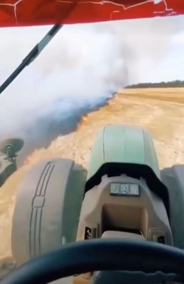 在俄军放火烧毁农田时,为了不让自己辛辛苦苦种出来的粮食化为灰烬,乌克兰农民冒着生命危险,用拖拉机贴着火线割出一条隔离带来。