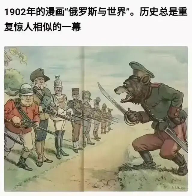 当时的英法德等国在欧洲牵制了大量的俄军,是俄国战败的重要原因,1902年的一幅漫画准确地刻画了那一时期俄国与世界的敌对关系,就如同他们今天一样。