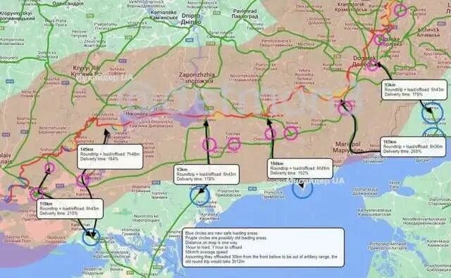 为了躲避海马斯的精准打击,南线俄军不得不将弹药库大幅后撤,躲到海马斯打击线之外(见下图)。