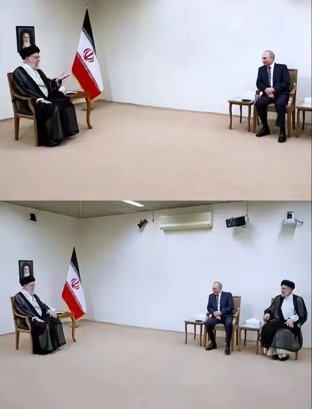 如下图,普京看起来就像是哈梅内伊的下属,完全没有在国内时,独自坐在长桌子一头的那种气势。