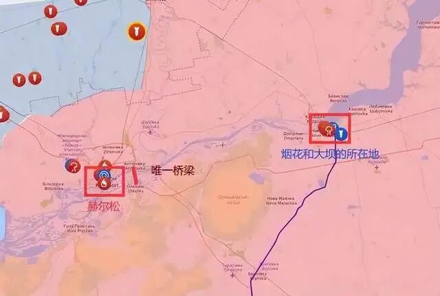 安托沃斯基大桥与新卡霍夫卡的大坝一起,构成了赫尔松北岸城区俄军唯二的两条补给线,当然也是第聂伯河北岸之俄军南撤的唯二通道(见下图两处红框)。