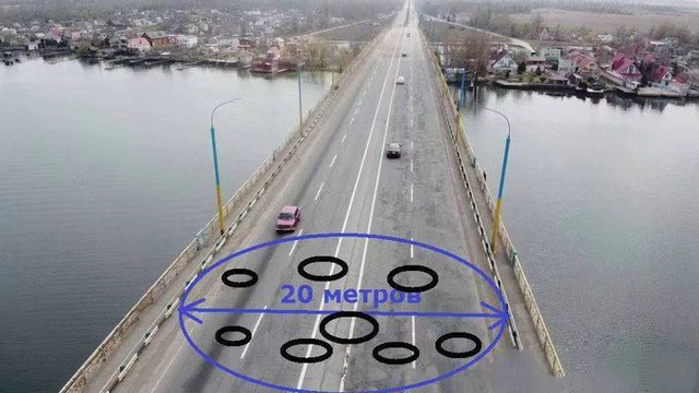 如下图,在长直径为20米的椭圆形范围内,密集分布了8个火箭弹坑,这种近乎于炫技般的轰炸,必定会对俄军的心理形成巨大的冲击——只需要再来一轮打击,大桥很可能就断了,要不要在退路被断之前撤退呢?