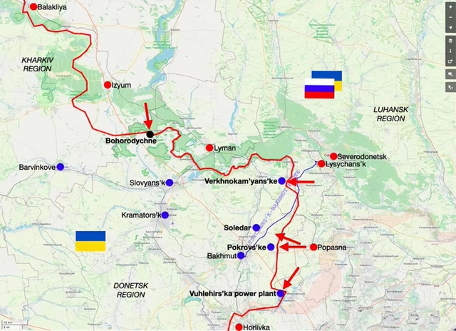 第二,在斯拉维扬斯克前线,俄军经过40天的进攻,仍然没有打下勃艮第(Bohorodychne),昨天,他们另辟蹊径,派出多个精锐的小分队,在Bohorodychne和Dolyna之间渗透,意图寻找突破口。从侧翼包抄乌军阵地。