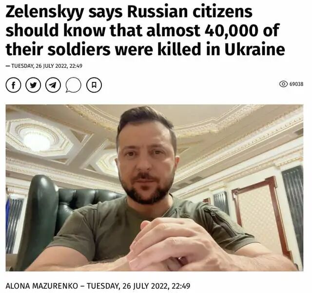 泽连斯基表示,自2月24日以来,俄罗斯武装部队已经损失了4万人,还有数万人受伤或者致残,每一个有任何方式向俄罗斯社会传递信息的人,都必须将这个简单的事实传达给俄罗斯人,因为俄罗斯政府没有将俄军惊人的死亡人数,告诉自己的公民。
