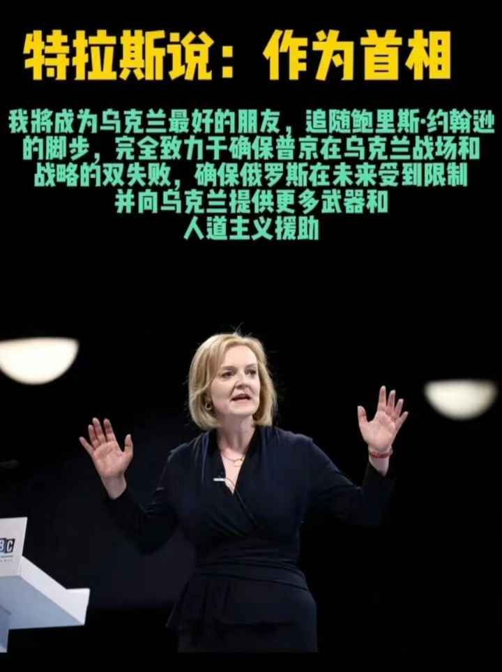 “作为首相,我将成为乌克兰最好的朋友,追随鲍里斯·约翰逊的脚步,完全致力干确保普京在乌克兰战场和战略的双失败,,,,,,”