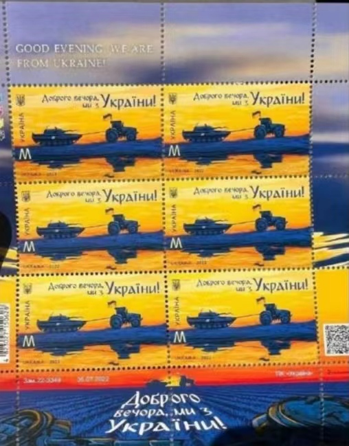 是的,邮票上的图画,正是乌克兰农民用拖拉机拉着俄军坦克回家的场景。