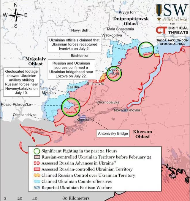 此地与其他俄军占领地区被第聂伯河分割开来,所以,俄军不管是输送补给还是增援,都必须要跨越宽广的第聂伯河或者绕道几十公里外的新卡霍夫卡,再跨越北茵古列茨河,才能抵达赫尔松。