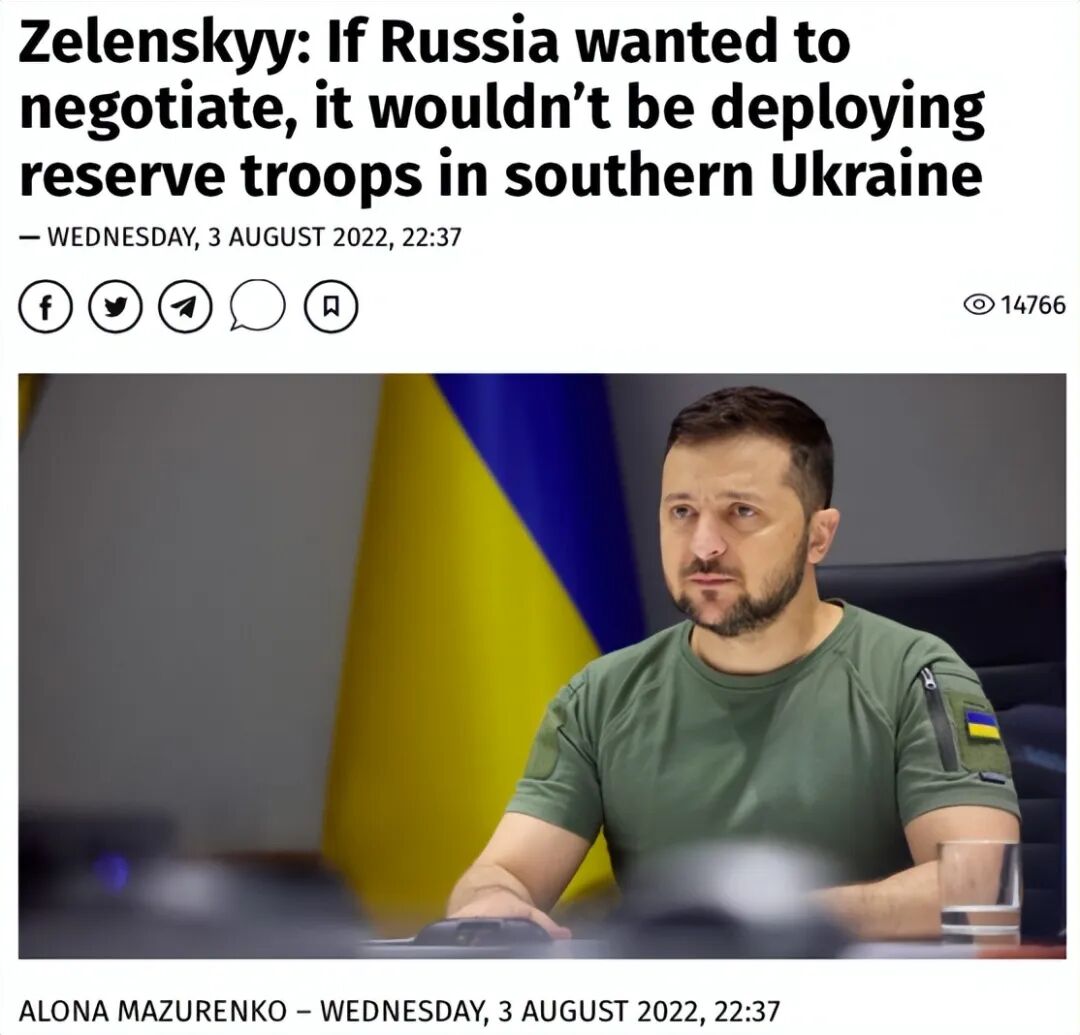 乌克兰总统泽连斯基此前在一次演讲中表示,他已经下令乌军在乌克兰独立日(8月24)之前在赫尔松发动反攻,展现其进行大规模进攻的能力。