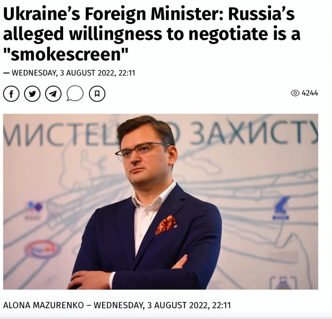 面对俄罗斯人抛过来的“橄榄枝”,乌方显得有些不屑一顾,外交部长库莱巴认为,俄国有关恢复和谈的任何说法都只是烟幕弹,只是为了延长战争。