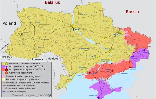 总体来看,俄军依然是三面合围、制造突出部的老战术,其中东面应该是俄军的主攻方向。