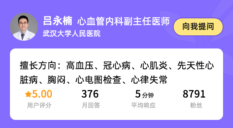 如果你想咨询案例中的吕永楠医生,点击下方医生名片,即可快速联系到吕医生,咨询当前碰到的高血压或者其他心血管问题困扰。