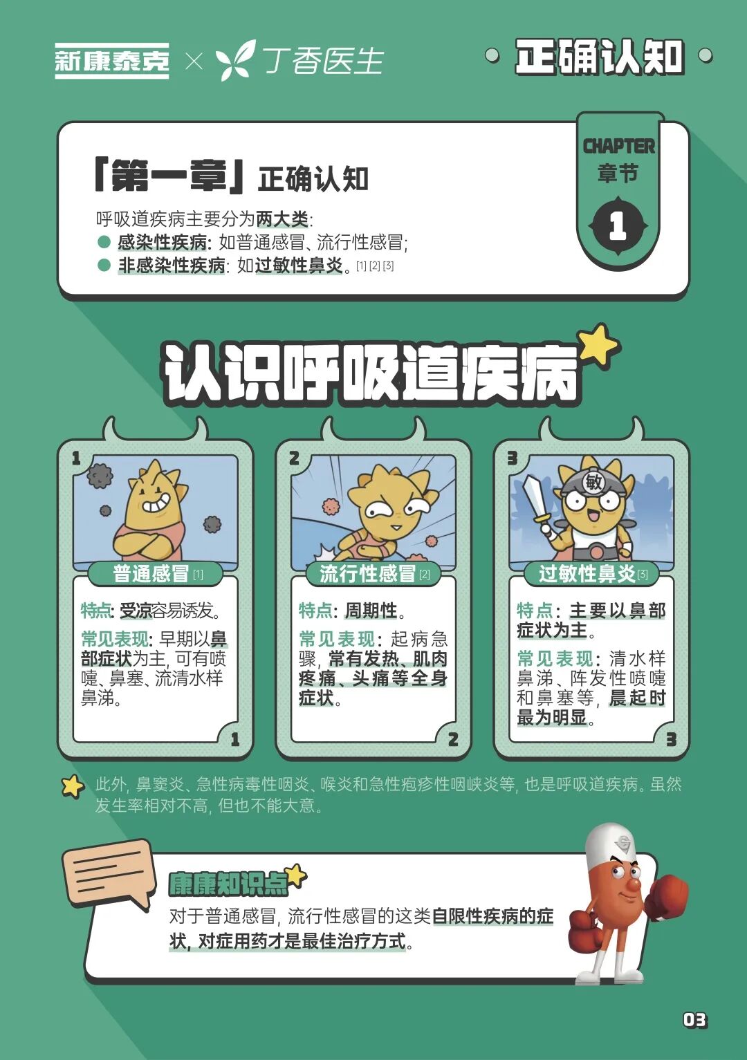 新康泰克和丁香医生强强联手,针对呼吸道常见不适,推出了「家庭药管家修炼指南」。指南中包含对呼吸健康问题的「正确认知」-「对症用药」-「日常防护」,内容丰富,生动有趣。