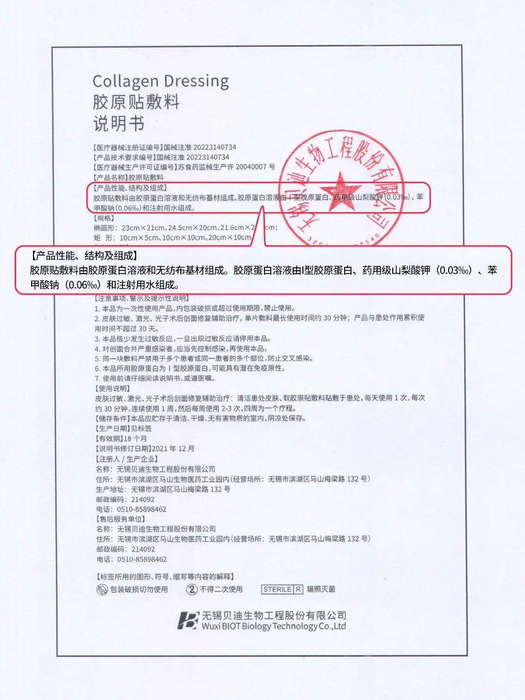 我们对照着肤可新的说明书给大家看一下,结构组成就是胶原蛋白溶液和无纺布,其它没了。