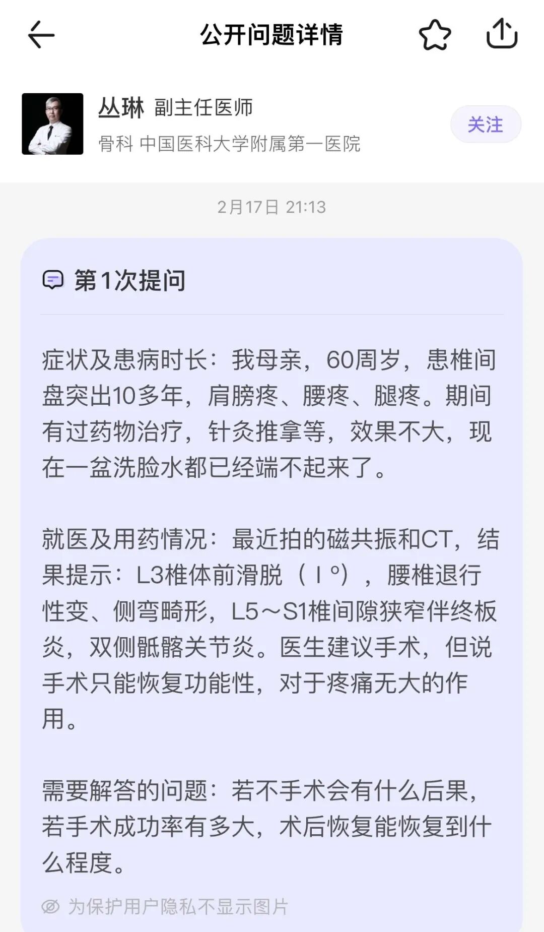➋ 已经去医院做过检查,但对于后续是否要手术、有没有其他治疗方案,还想再找个医生看看
