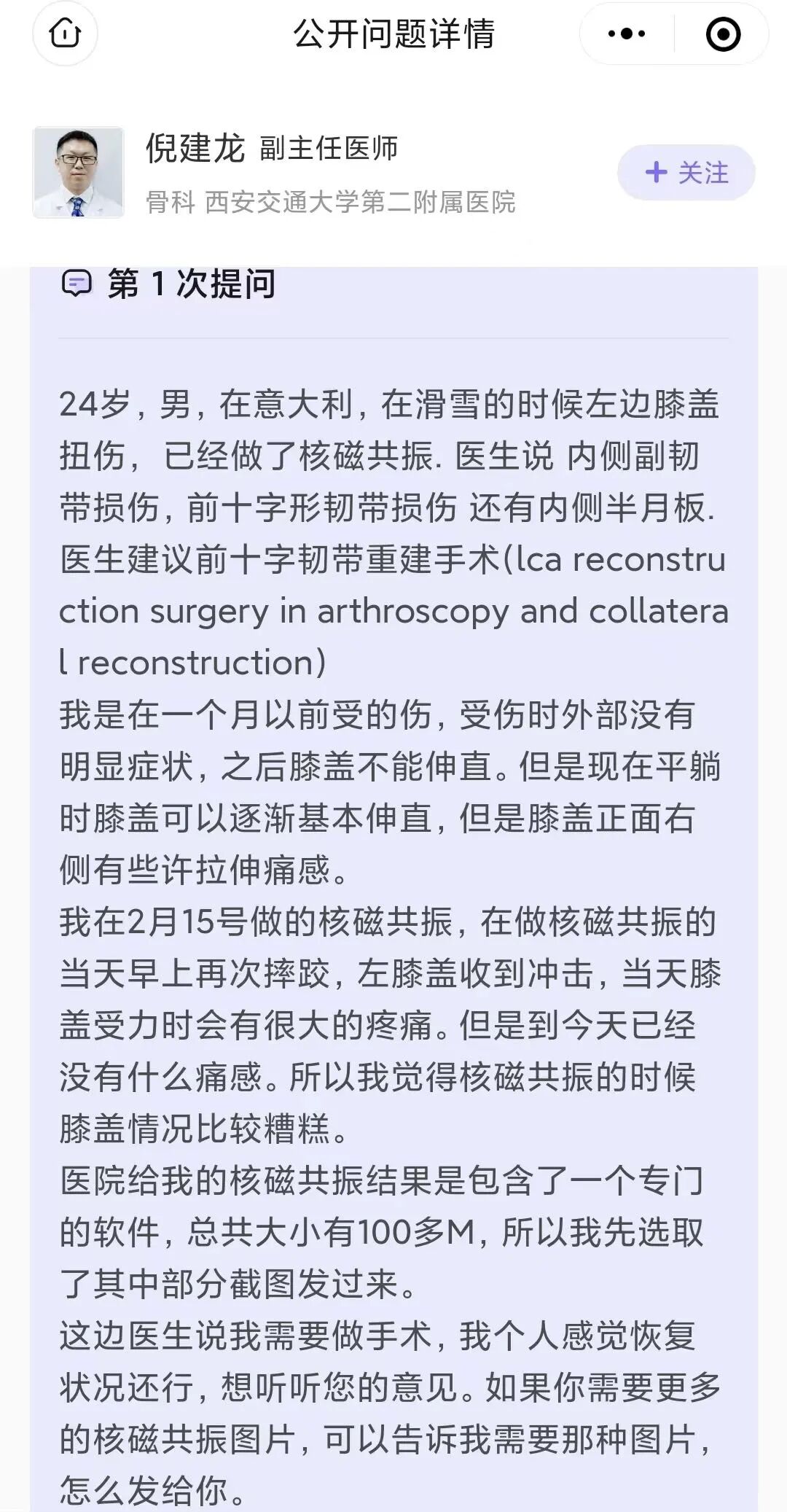 如果已经去过医院拍了片子,也可以把看结果的链接或者二维码发给医生。