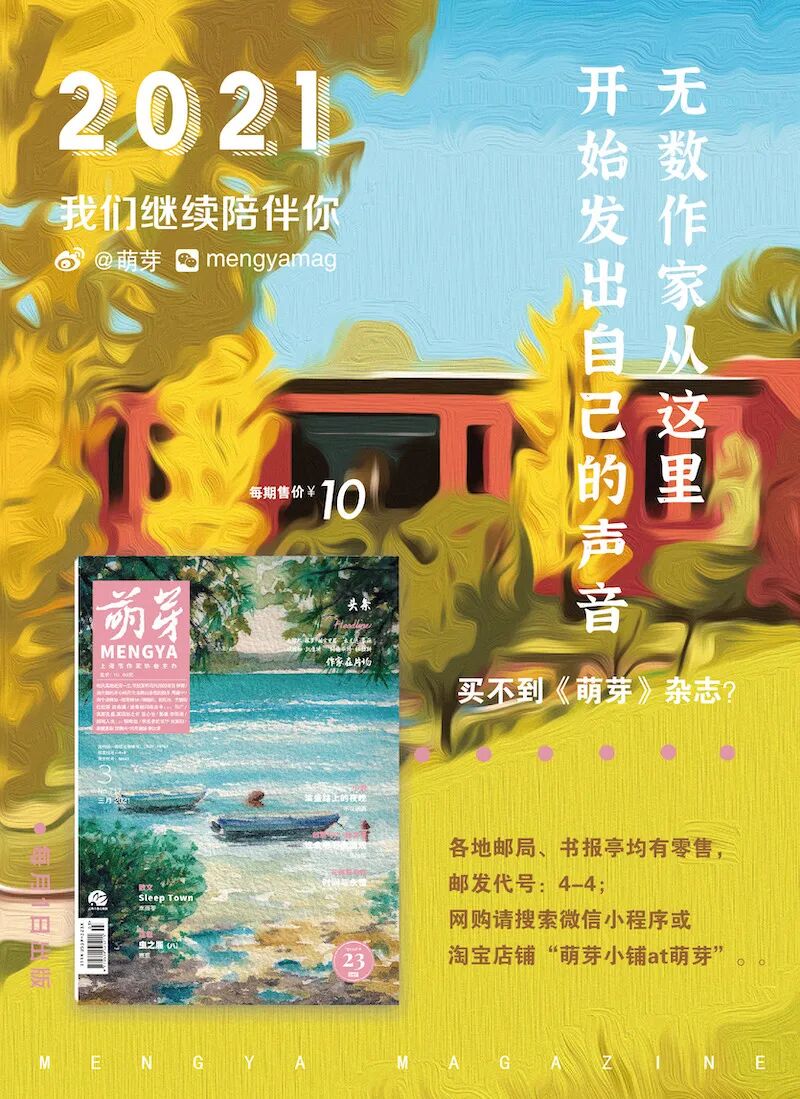 头条“作家在片场”通过五位作家兼导演的人生经历,讲述文学之外属于创作者的天命;连载《虫之履》迎来第八章!各地邮局、报刊亭均有零售;邮局订阅邮发代号:4-4;网购请搜索微信小程序或淘宝店铺“萌芽小铺at萌芽”。