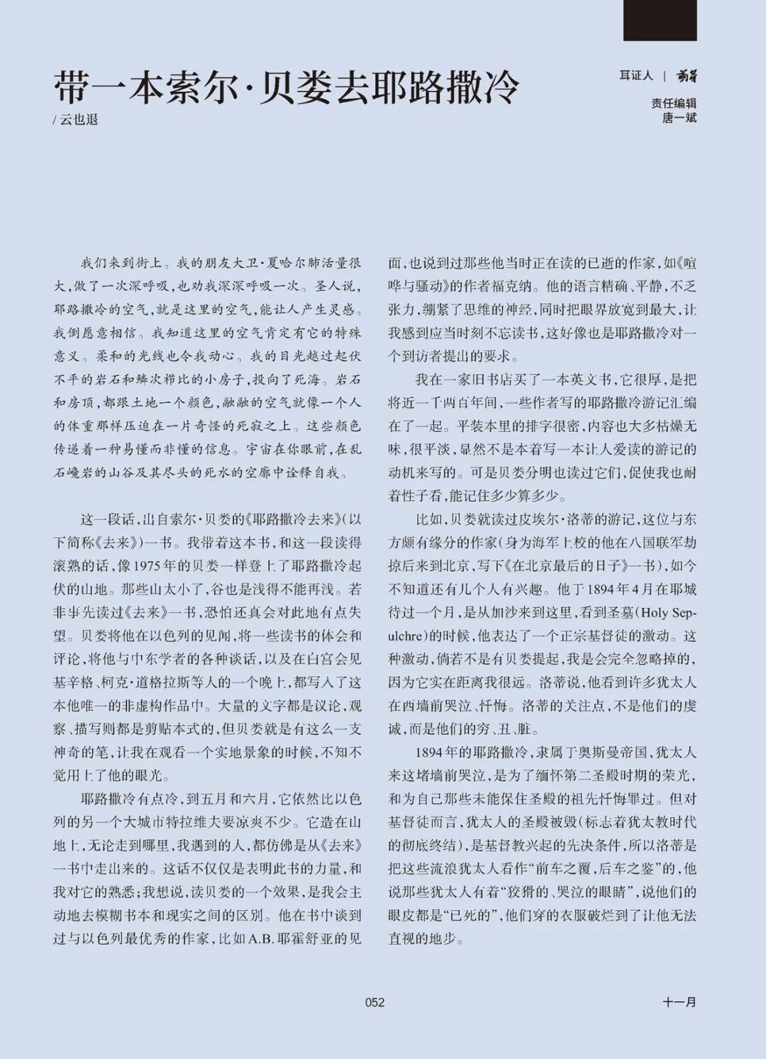 带着索尔·贝娄的《耶路撒冷去来》,我像1975年的贝娄一样来到耶路撒冷。在历史上来此进行“阅读型朝圣”的文人中,洛蒂曾采取自然主义的风格,写实而准确地记录了西墙前的景象;夏多布里昂则运用其渊博的知识,将那些神秘的故事升华为一种现实。而贝娄在前人记录的基础上,用发现奇迹的眼光观看了这里的一草一木,并从超自然的角度描写了他所体会到的神圣气氛,实现了一种富有智性的浪漫主义。