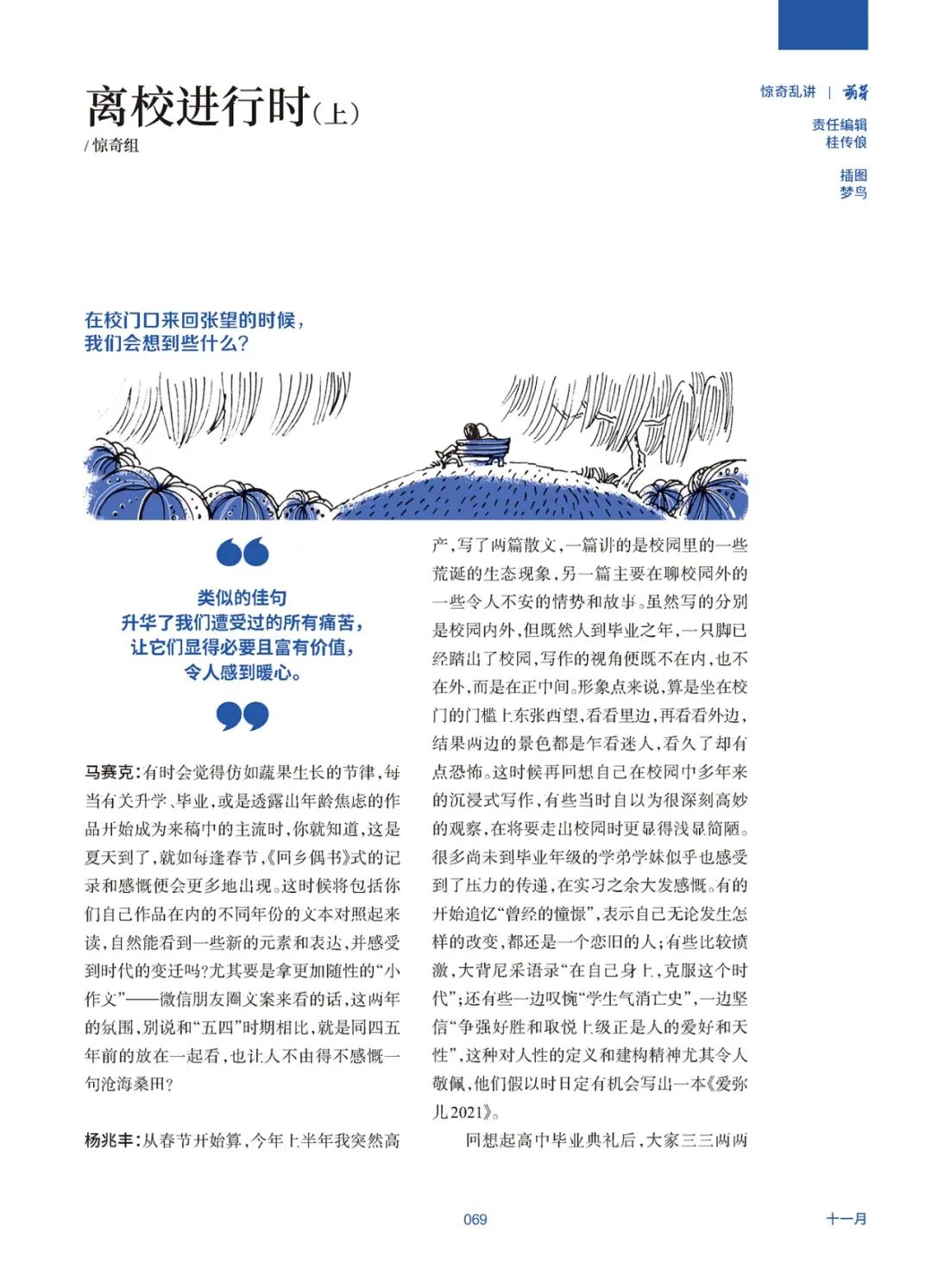 2021的毕业季已经落幕,在毕业倒计时、告别演出、师长致辞等一系列热闹的仪式后,离开校园、初入社会的大学生们有哪些复杂的感受?如今的校园生活有哪些新的潮流,学生们的内心世界又发生着怎样的转变?
