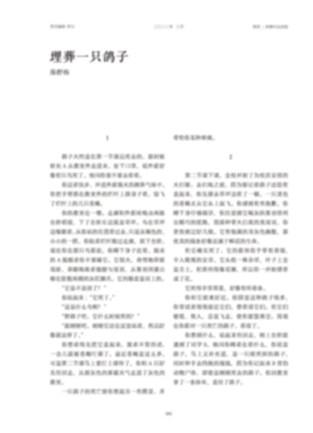 鸽子大约是在第一节课后死去的,带着令人敬畏的安详。它的死亡使你想起与学校里最近的欢乐气氛不太相符的另一些图景,并带给你某种疼痛感。同学说要扔掉它,你于心不忍,打算好好地埋葬它,可是下课时间短暂,你只能给它一个潦草的墓穴。也许在你看不见的地方还有很多这样的鸽子,而你只埋了这一只,也只有力气埋掉这一只。