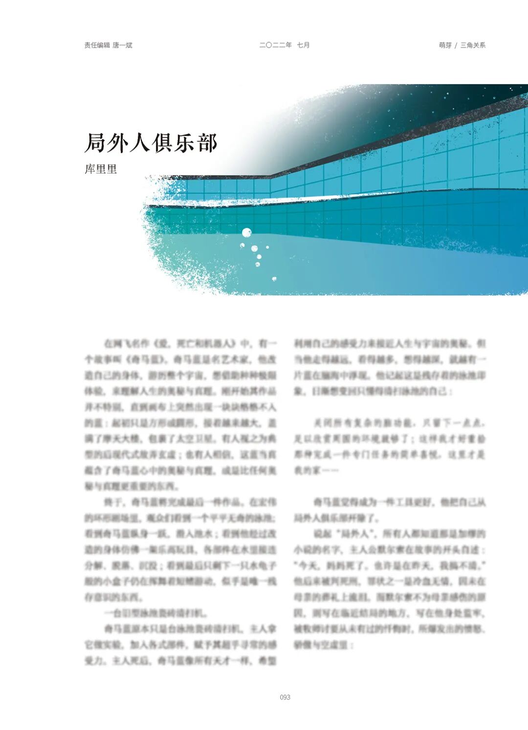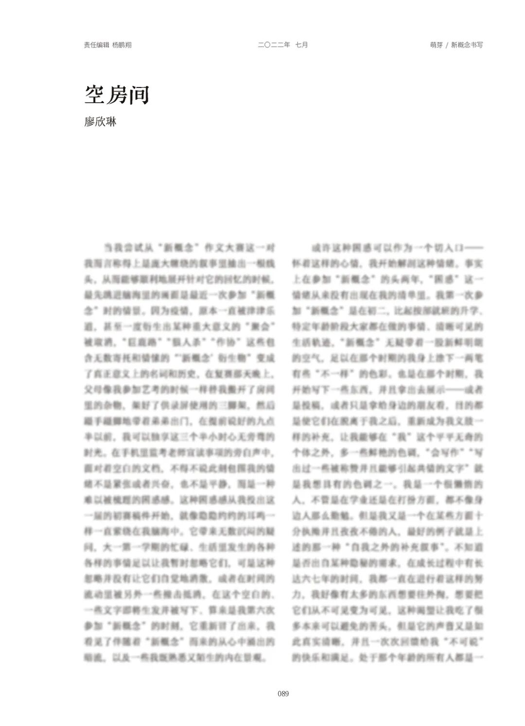 我在初中时开始参加“新概念”作文大赛,处于那个年龄的所有人都是一间空空如也的房间,我们努力为空房间赚到一些装饰物,而我选择搬入了一盏水晶灯。但后来,我逐渐意识到,无论我搬入再多精美的物件,想用它们来凸显出生活隐秘而真实的那一面,都不能够改变这个房间“空”的本质。这是我第六次参加“新概念”了,我反复地将房间填满又搬空,最后终于在书写时感受到了某种全然的放松,我所一遍遍验证的,原来正是在命运的指引下早已书写过的答案。