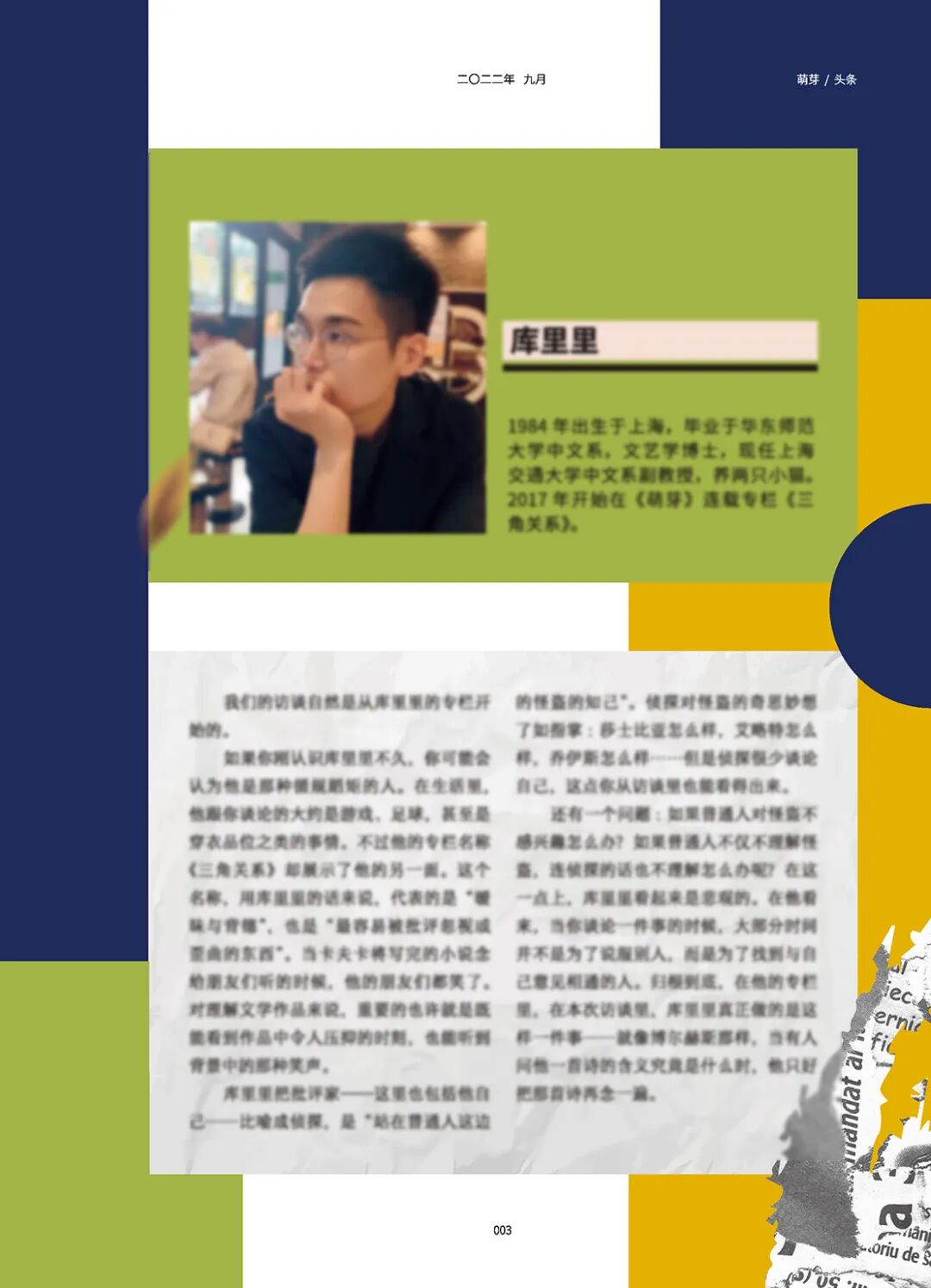 2017年起,库里里开始在《萌芽》连载专栏《三角关系》,在此次访谈中,他以石黑一雄的《别让我走》、鲁迅的《故乡》为例,展示了在理解文学作品时的潜在“公式”,并提醒我们无论是混淆还是过度强调主人公与作家本人的做法都有失偏颇。同时,他结合艾略特、乔伊斯、福楼拜、博尔赫斯、加缪、纳博科夫等作家的写作经验,围绕文学作品如何选择、创造或隐藏细节,以及经典名著中的文本缺陷等问题展开了细致的探讨。