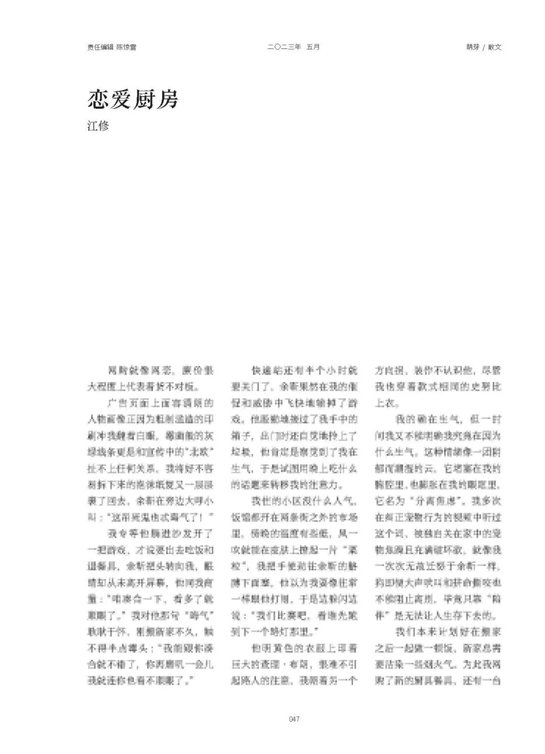 在妈妈眼中,让我做饭等于浪费水和蔬菜,我也自认没有为爱情囿于厨房的觉悟。曾经的恋人先于我找到工作,也先于我步入人生的下一阶段,其间我的厨艺一直上不了台面,再不敢把过多的情感倾注于与我没有太大关系的房间,怕因为某些原因再度流离失所。后来,余靳进入了我的生活,隔三差五地来我的新家给我做饭。随着工作压力的增大,曾经渴望的生活仪式感逐渐变成负担。所谓仪式感不过是一枚令人安心的锚点,辗转与损耗其实也并不会成为生活支离破碎的预兆。