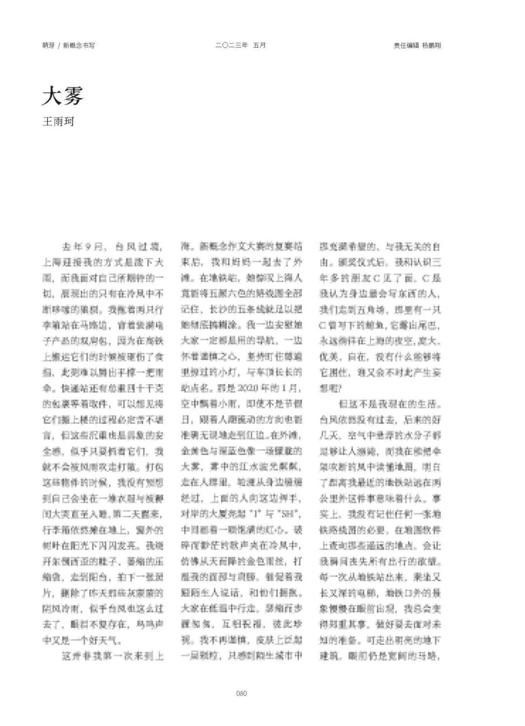 去年九月,台风过境,上海迎接我的方式是泼下大雨。我独居在宿舍,时常面对着电脑空白文档做一些苦行僧般的无效的修行。我安慰自己这不算溃败,只要能写出一丁点还不错的东西,就算是好的开端,同时却傲慢又愚蠢地回避着一个更为重要的前提:如果我真的写得不好呢?谁能说不是幸运支撑我走到这一步的呢?新概念作文大赛不仅令我对陌生的城市与生活产生妄想,更是我所走过的道路中的重要节点,那时看不清未来的方向,也能用手里一盏小小的灯照亮眼前的路,凭此大胆地往雾里走去。