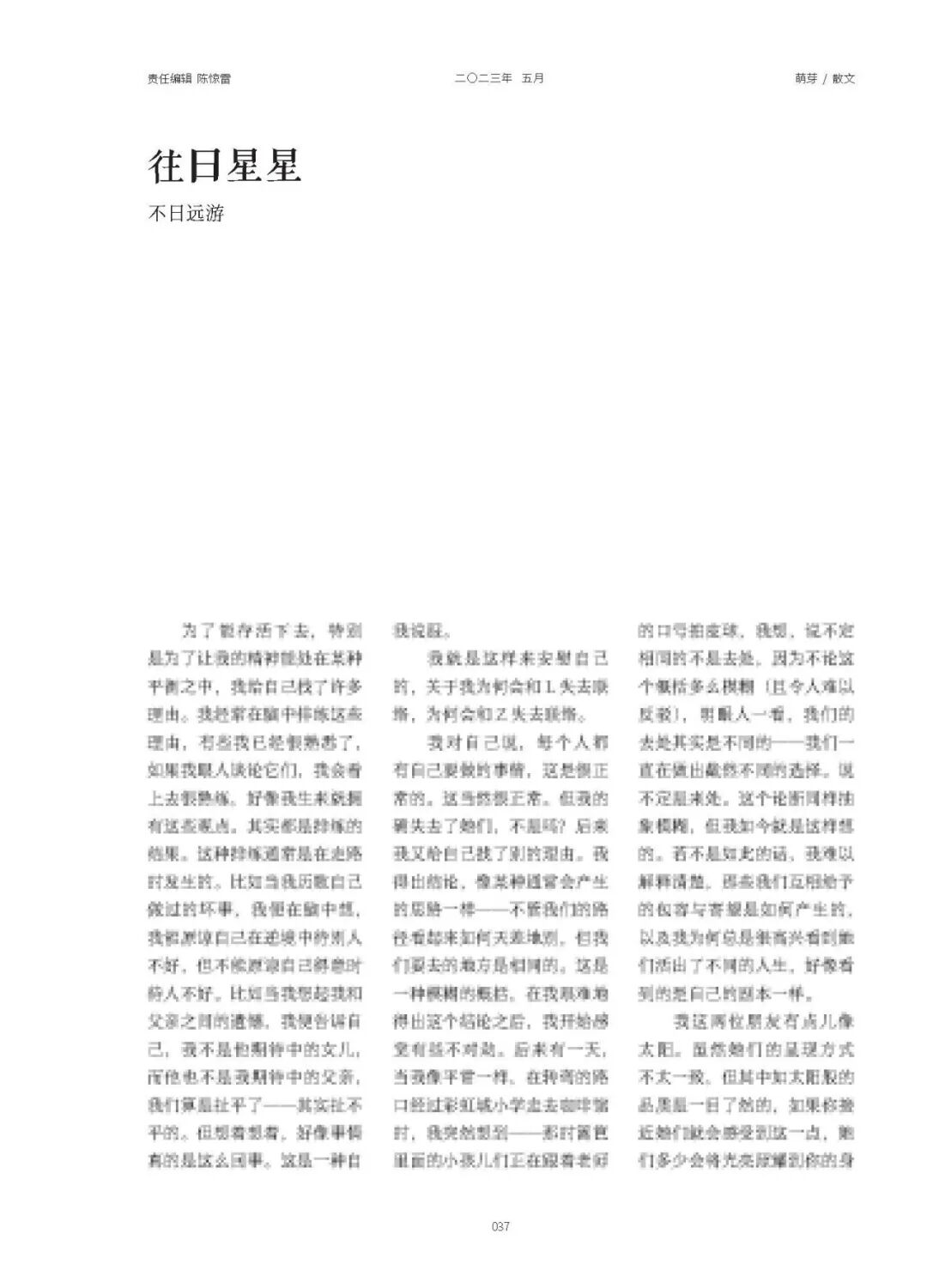 我的朋友Z与L都有点儿像太阳,其中Z像太阳本身,她保持良好的品质,认为世界与未来都会逐渐变得更好,L则拥有一视同仁的光芒,能照到阴暗的角落和废墟,照到每一个奇怪的人身上。我曾与Z一起践行“举手之劳,我们能做的还有很多”的准则,也曾从L那里得到过许多倾听与理解,却难以解释为什么我们现在失去了联络。如今我们都已经迈入三十岁,那些我们曾互相给予的包容与寄望多少塑造了我,我也总是很高兴看到她们活出了不同的人生。