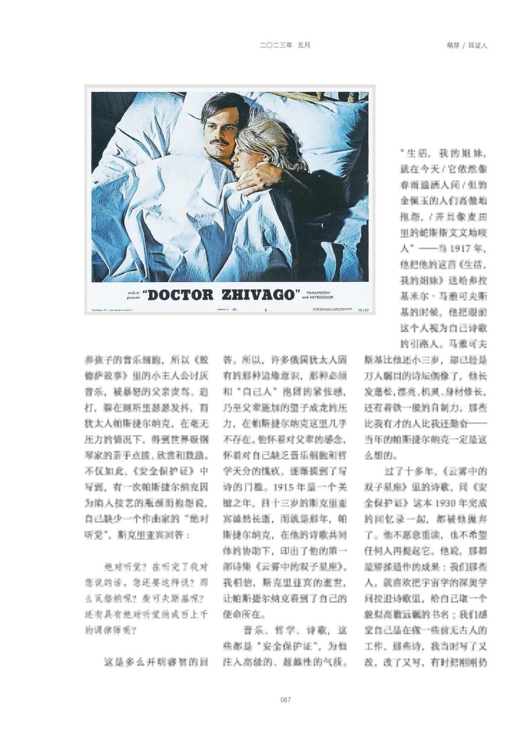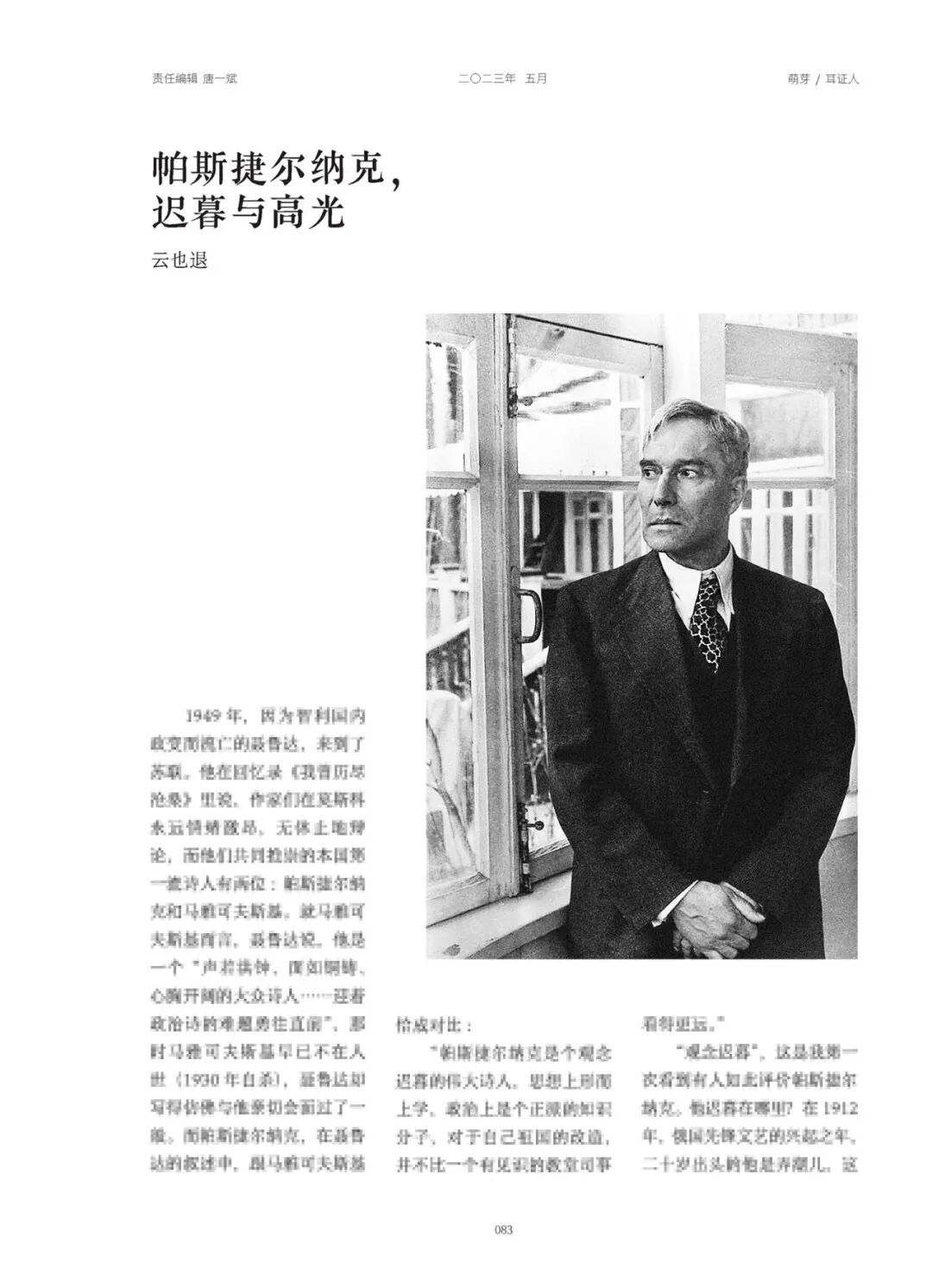 帕斯捷尔纳克是俄国先锋文艺的弄潮儿,之后成为公认的大师,可聂鲁达却评价他是个“观念迟暮”的诗人。帕斯捷尔纳克本人是犹太人,然而许多俄国犹太人固有的边缘意识,那种必须和“自己人”抱团的紧张感,乃至父辈施加的望子成龙的压力,在他这里几乎不存在——这位诗人是被“供”起来的。音乐、哲学、诗歌不过都是“安全保护证”,为他注入高级的、超越性的气质,可他了不起的诗篇并不真正被需要。直到在回忆散文《人与事》中清楚认识到了这一点,帕斯捷尔纳克才终于迎来了他的“高光时刻”。