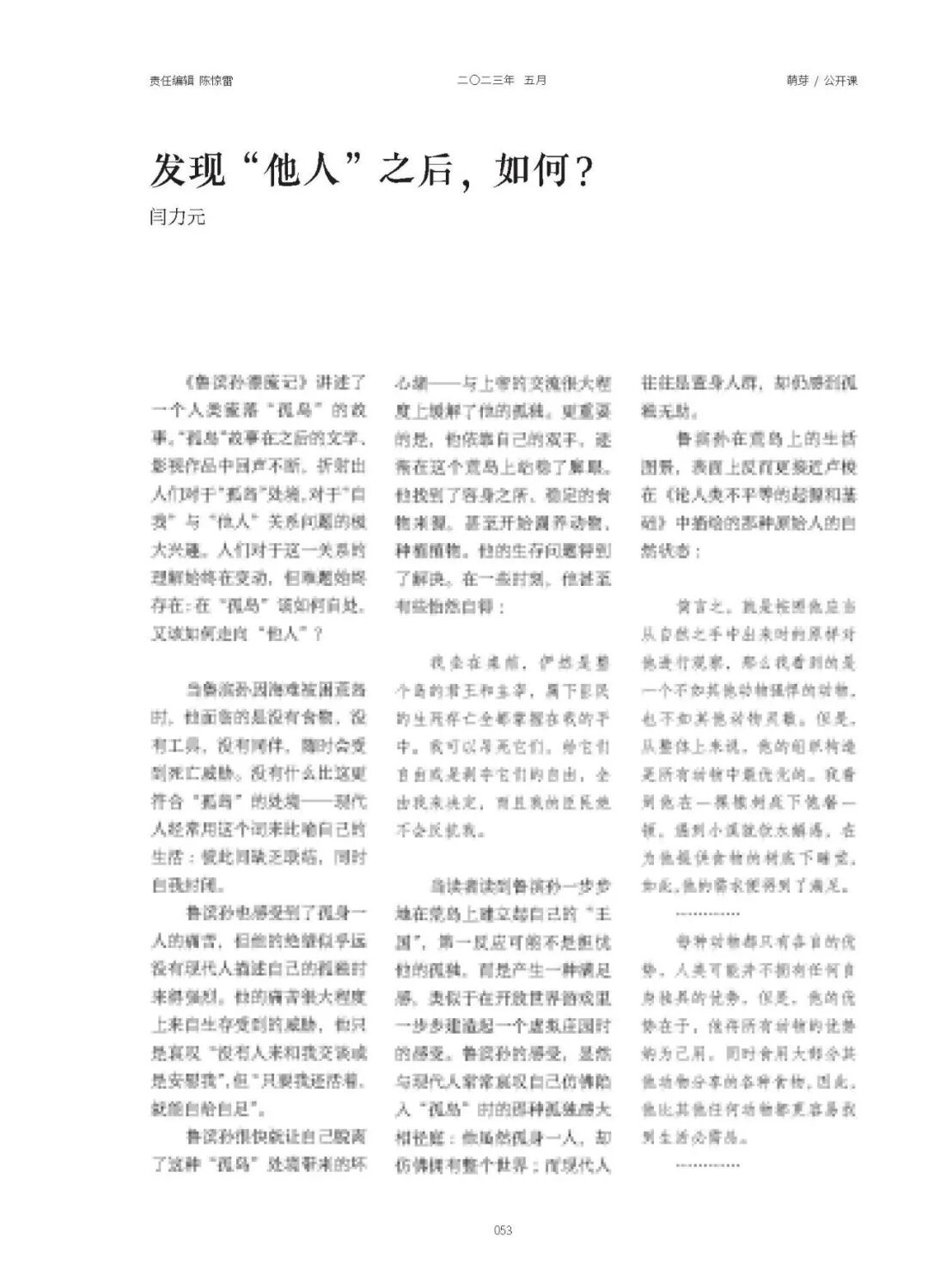 不同于鲁滨孙在荒岛中孤身一人的处境,卡尔维诺笔下选择终身在树上生活的柯西莫展现出现代意义上的“孤独”状态,即一种无法与“他人”建立关系的处境。在“孤岛”该如何自处,又该如何走向“他人”始终是一个难题:萨特在《禁闭》中用“他人即地狱”表达对于“自我”与“他人”关系的悲观理解;村上春树试图用“爱”为这种孤立的处境找一个出口;哲学作家韩炳哲和社会学家项飙则寄希望于一种广义上的“附近”的回归……但无论如何,“走向”的那个动作是唯一确定的,这同时也意味着一种积极的责任。