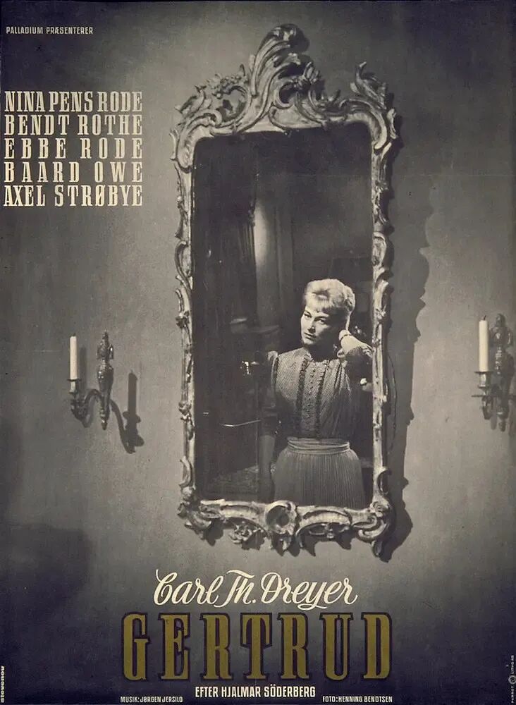 当我们尝试理解德莱叶,过往影人与理论家给出的最常见入口便是“空间”。比如德勒兹便将其特点概括为“空间深度的缺失,或是空间维度的遏制”,“空间”也是德莱叶访谈中最常出现的概念。比如在1965年纽约电影节上,德莱叶回顾自己的首部长片《审判长》时说道:“我花了很大功夫在背景设计上,因为我要保持每个房间的格调,使每间卧室表现出居住者的性格特点,在这一点上我受到了丹麦画家哈默修伊还有英国画家惠斯勒的影响。”而在跨越半个世纪,于去年年底在上海展映的《葛楚》中,几个室内场景也再次带给人与哈默修伊的代表作《白色的门》《室内》等作品相似的心理感受,光线被重重门框切割出明区与暗区,人物在房中的位置与姿态,及其与静物之间形成的某种关系,让整体空间被赋予了物理存在之外的唤醒人类感知的能量。德莱叶本人将他在《葛楚》中创造的这种空间命名为“第五度空间”,也即“心理空间”。套用里尔克对哈默修伊的评价,“其作品往往在某一个时空中转译为冗长而舒缓的步调,并提供观赏者谈论艺术里最基本且重要的元素”,《葛楚》也便是在这个第五度空间中迈着自己冗长(118分钟)而舒缓(89个镜头)的步调,以女主角葛楚为线索,谈论着爱情这一最基本且重要的元素。