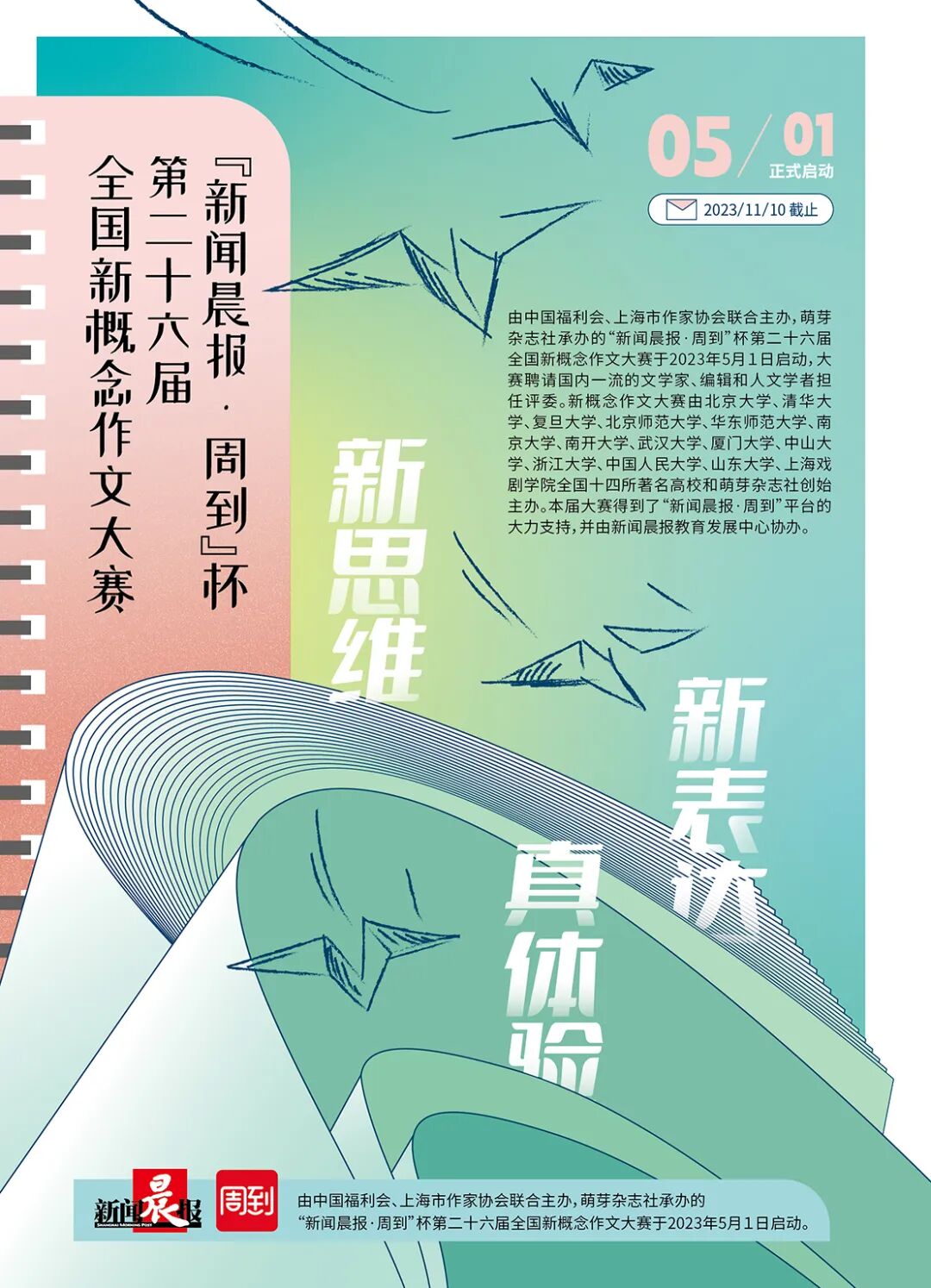 由中国福利会、上海市作家协会联合主办,萌芽杂志社承办的“新闻晨报·周到”杯第二十六届全国新概念作文大赛于2023年5月1日启动,大赛聘请国内一流的文学家、编辑和人文学者担任评委。新概念作文大赛由北京大学、清华大学、复旦大学、北京师范大学、华东师范大学、南京大学、南开大学、武汉大学、厦门大学、中山大学、浙江大学、中国人民大学、山东大学、上海戏剧学院全国十四所著名高校和萌芽杂志社创始主办。本届大赛得到了“新闻晨报·周到”平台的大力支持,并由新闻晨报教育发展中心协办。