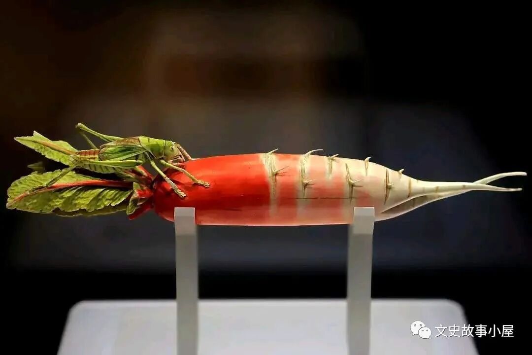 红萝卜长度约为30厘米,从萝卜的配色,到萝卜上面的根须,甚至连须上藏着的没有洗干净的泥土都被工匠一一精细地展现出来。萝卜上趴着一只大蝈蝈,其造型饱满逼真,似乎在贪婪的吸取汁水。刀工精细、刀法圆润、造型生动。