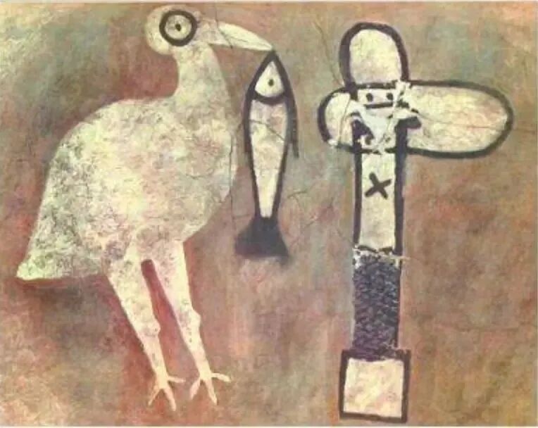 左边一只鹳鸟,昂首挺立,六趾抓地,二目圆睁,口含一条大鱼;右边一把石斧,斧头捆 绑在竖立的木棒上端。