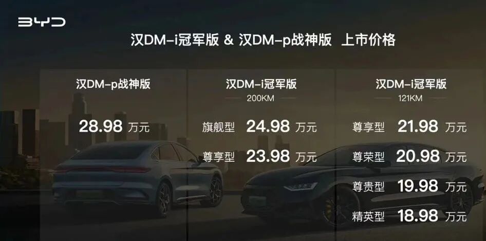 比亚迪汉DM-i冠军版,中高端B级轿车市场的颠覆者。比亚迪汉DM-p战神版,个性化混动超跑。双剑合璧,剑指合资品牌。
