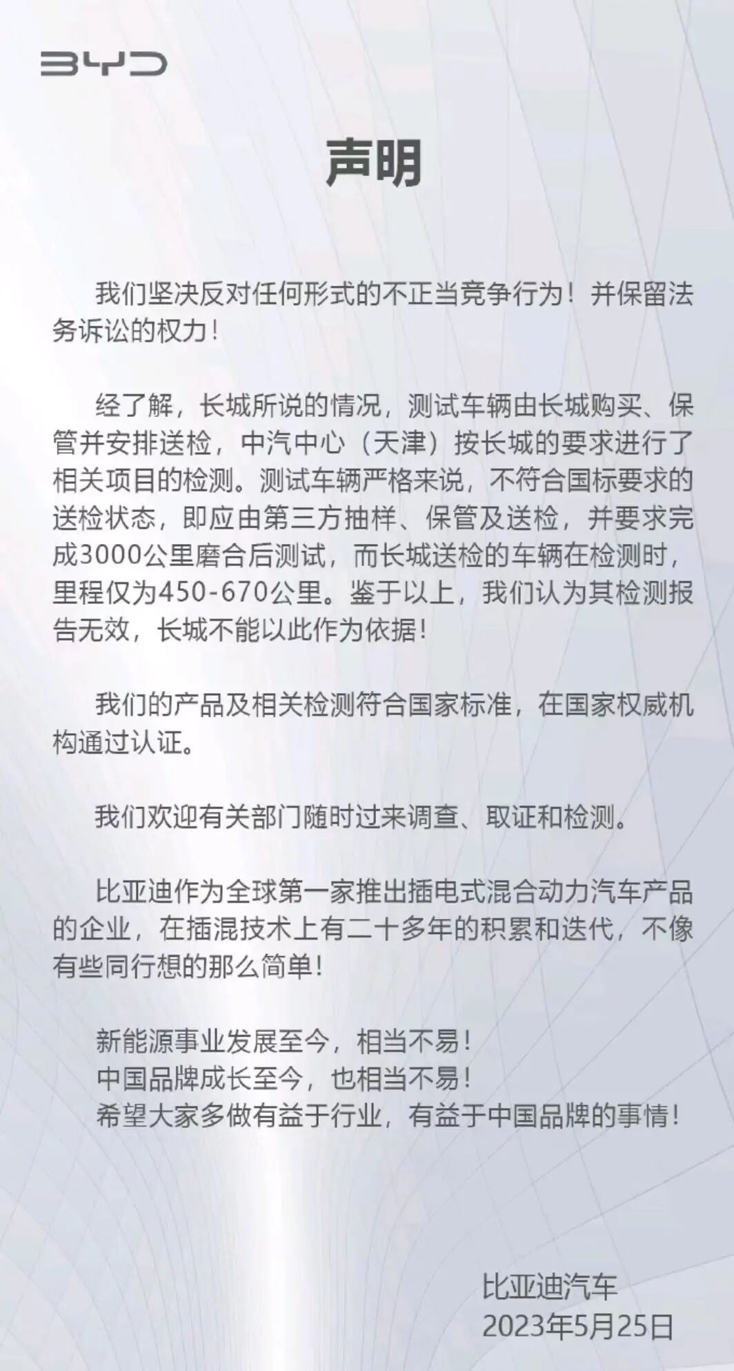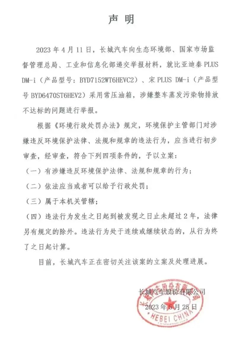 5月25日上午,长城汽车发表声明,举报比亚迪秦Plus DM-i、宋Plus DM-i蒸发污染物排放不达标。