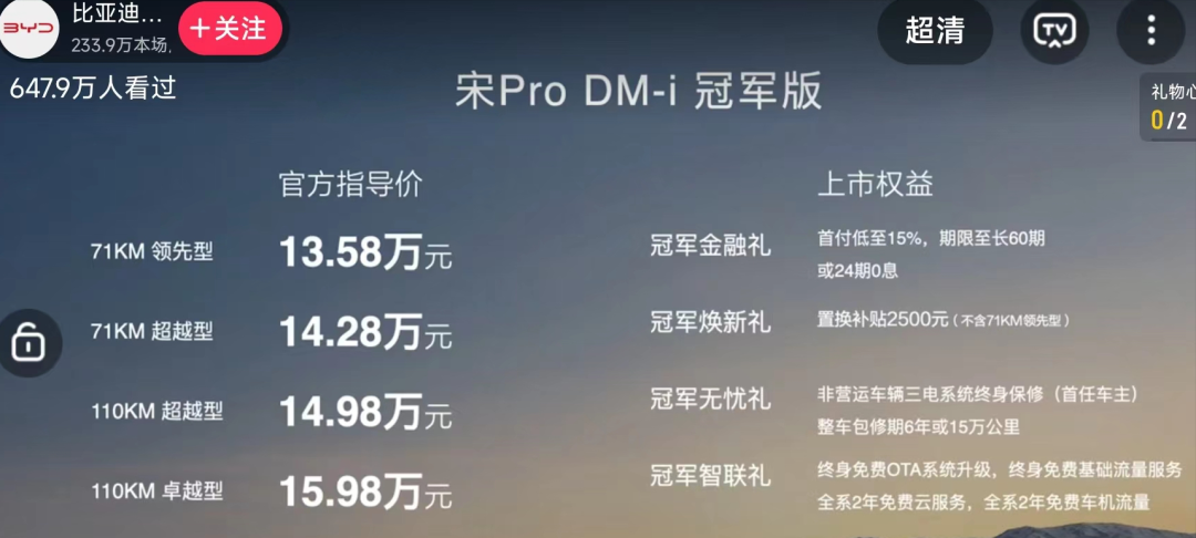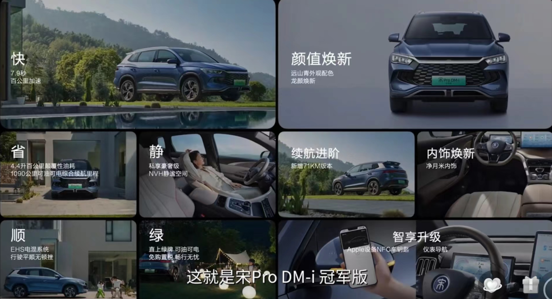 5月25日,比亚迪宋Pro DM-i冠军版上市,共推出4款车型,售价区间为13.58万-15.98万元。