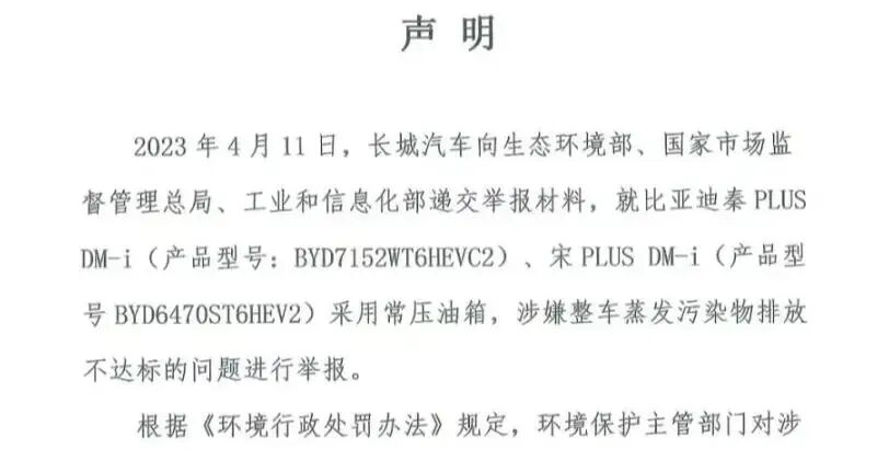 5月25日,长城汽车发表声明,举报比亚迪秦Plus DM-i、宋Plus DM-i蒸发污染物排放不达标。