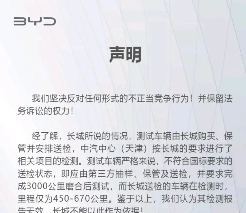 随后比亚迪也发表声明,称检测用的车辆提供流程不符,车辆状态也不满足要求,检测报告无效。