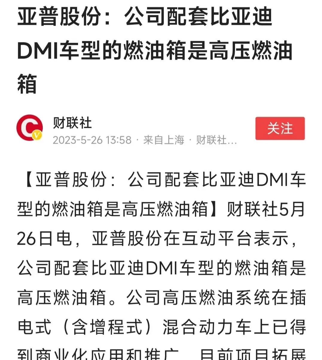比亚迪油箱供应商神补刀来了。亚普股份在网络平台上声称,公司给比亚迪DMI车型提供高压油箱。