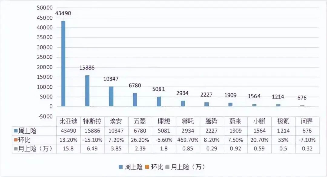 在新能源车型上,比亚迪以43,490辆的上险量高居榜首。特斯拉和埃安以15,886辆、10,347辆分列亚军和季军。
