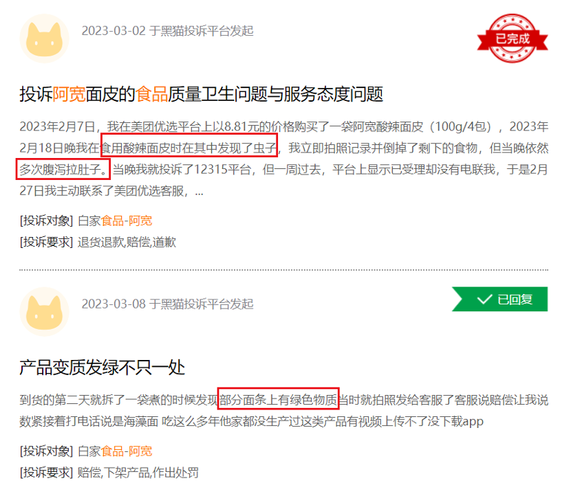 此外,在第三方投诉平台黑猫投诉上,也有大量与阿宽食品有关的投诉,累计投诉量高达上百条,其中大部分消费者的投诉问题都集中在产品中存在虫子、毛发、异物等问题上。