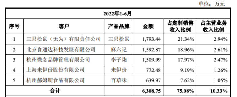 截至2022年1-6月,三只松鼠、麻六记、李子柒、来伊份和百草味是其排名前五的代工品牌。三只松鼠作为阿宽食品的最大代工客户,销售金额为1793.44万元。