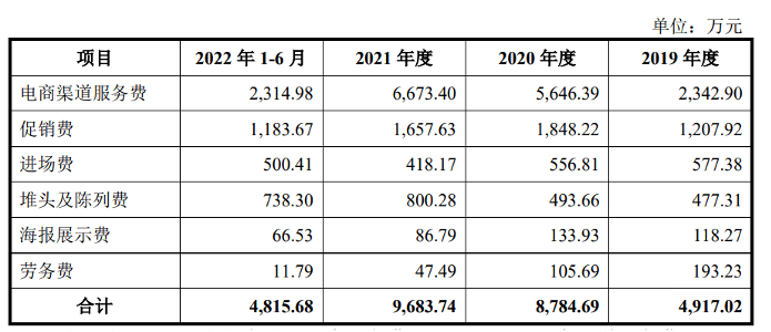 招股书显示,2019-2022上半年,阿宽食品的电商渠道服务费分别为2342.90万、5646.39万、6673.40万和2314.98万。也就是说,在2020年2.3亿的电商自营收入中,有近25%需要作为推广费用支付给电商平台和主播。