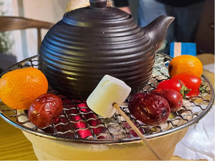 窗外冷风呼啸,小雨淅沥,屋内却是另一幅光景。生一炉炭火,摆上一壶热茶,四周散落着橘子、红薯、棉花糖,茶香果香正随着热气上扬。再约上三五好友围坐一桌,喝茶聊天吃果脯……对美好生活的想象,大概就在这了。